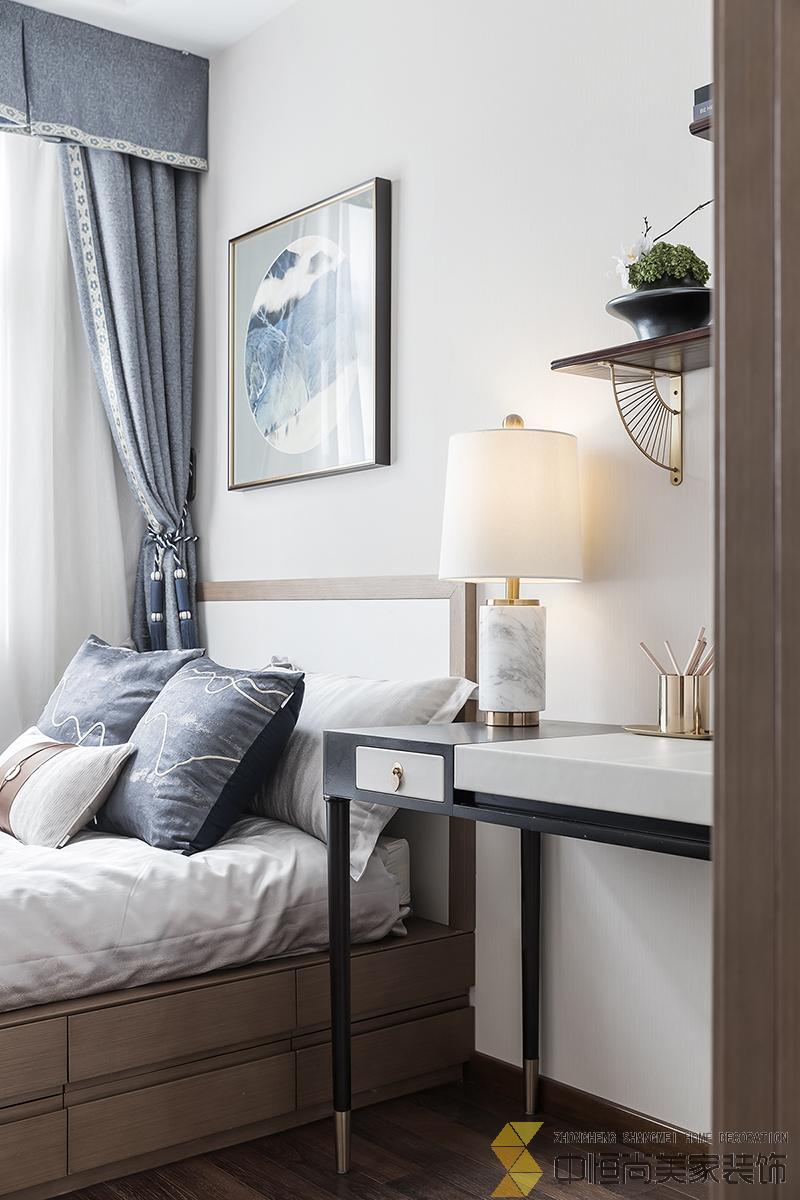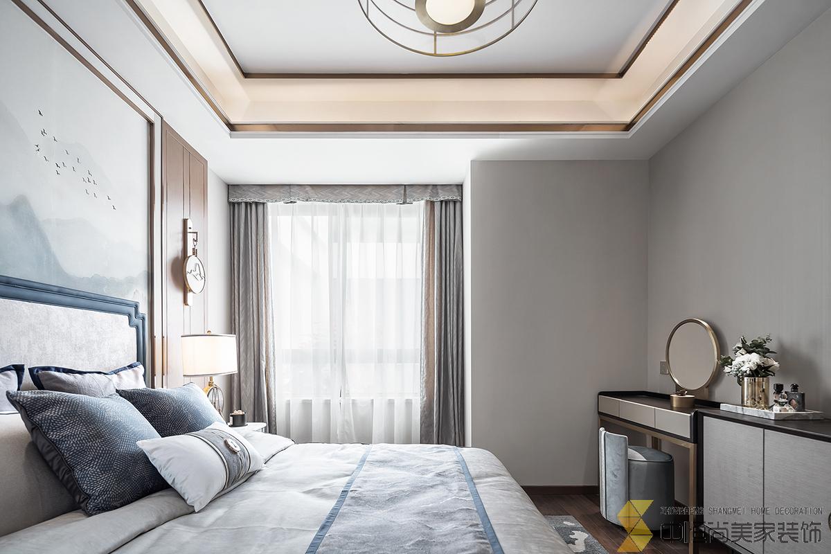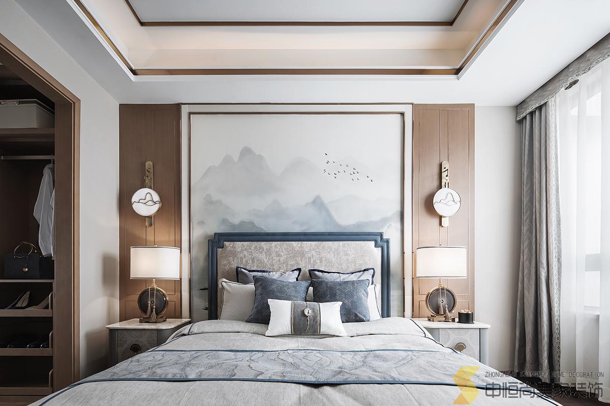 • 室内主色调汲取了江南水乡高级烟灰蓝,在空间中铺陈出别有风致的现代中式美学,处处透露着对东方清雅生活意境的美好追求。整个空间中,没有任何显着的东方符号堆砌,言有尽,意无声,却自始至终浸透着东方特有的禅思静谧。 素雅的米灰色平静而柔和,温暖的琥珀色、深邃的烟灰蓝与木色搭配相得益彰,坐榻端正清秀,山水峻秀,云之缥缈。隐约的水墨背景与两侧的金属屏风,构成虚与实,疏与密的哲学均衡美,茶几大理石的纹路自然演绎了一幅自然山水之美,赋予空间绵绵不尽的诗意想象。 卧室的设计中,色彩的运用清幽淡雅,沉静的灰蓝调和趋近自然的木色是空间的主调,丝质与棉麻床品深具质感,水墨背景造型、瓷器台灯、花卉等各类小品摆设其中,相映成趣,空间气质盈盈。